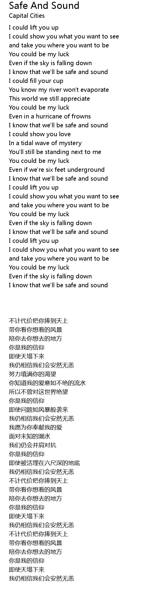 Safe And Sound - Capital Cities (Lyrics) "Safe and Sound" available on Capital Cities' debut album 'In A Tidal Wave of Mystery,' download on iTunes - Follow Capital Cities: - - - - - Safe And Sound Lyrics: Verse 1 I could lift you up I could show you what you wanna see And take you where you wanna be You could be my luck Even if the sky is falling down I know that we'll be safe and sound We're safe and sound Verse 2 I could fill your cup You know my river won't evaporate This world we still appreciate You could be my luck Even in a hurricane of frowns I know that we'll be safe and sound Chorus (Safe and sound) We're safe and sound (Safe and sound) We're safe and sound (Hold your ground) We're safe and sound (Safe and sound) Verse 3 I could show you love (Love) In a tidal wave of mystery You'll still be standing next to me You could be my luck Even if we're six feet underground I know that we'll be safe and sound (Sound, sound, sound) We're safe and sound (Sound, sound, sound) Chorus (Safe and sound) (Safe and sound) (Hold your ground) (Safe and sound) Verse 4 I could lift you up I could show you what you wanna see And take you where you wanna be You could be my luck Even if the sky is falling down I know that we'll be safe and sound I could lift you up I could show you what you wanna see And take you where you wanna be You could be my luck Even if the sky is falling down I know that we'll be safe and sound Outro We're safe and sound We're safe and sound We're safe and sound We're safe and sound (Safe and sound) We're safe and sound (Safe and sound) We're safe and sound (Hold your ground) We're safe and sound (Safe and sound) We're safe and sound Connect with us : Facebook: - Spotify: - Twitter: - Instagram: - Let's Be Friends on Facebook // - "If you'd like to submit a video to the channel, please visit: - Or contact - Safe And Sound - Capital Cities (Lyrics) #SafeAndSound #CapitalCities #SuperbLyrics
